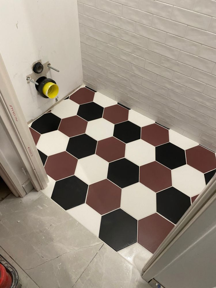 Voici deux réalisation, avec des carreaux hexagonaux imitation tomettes.